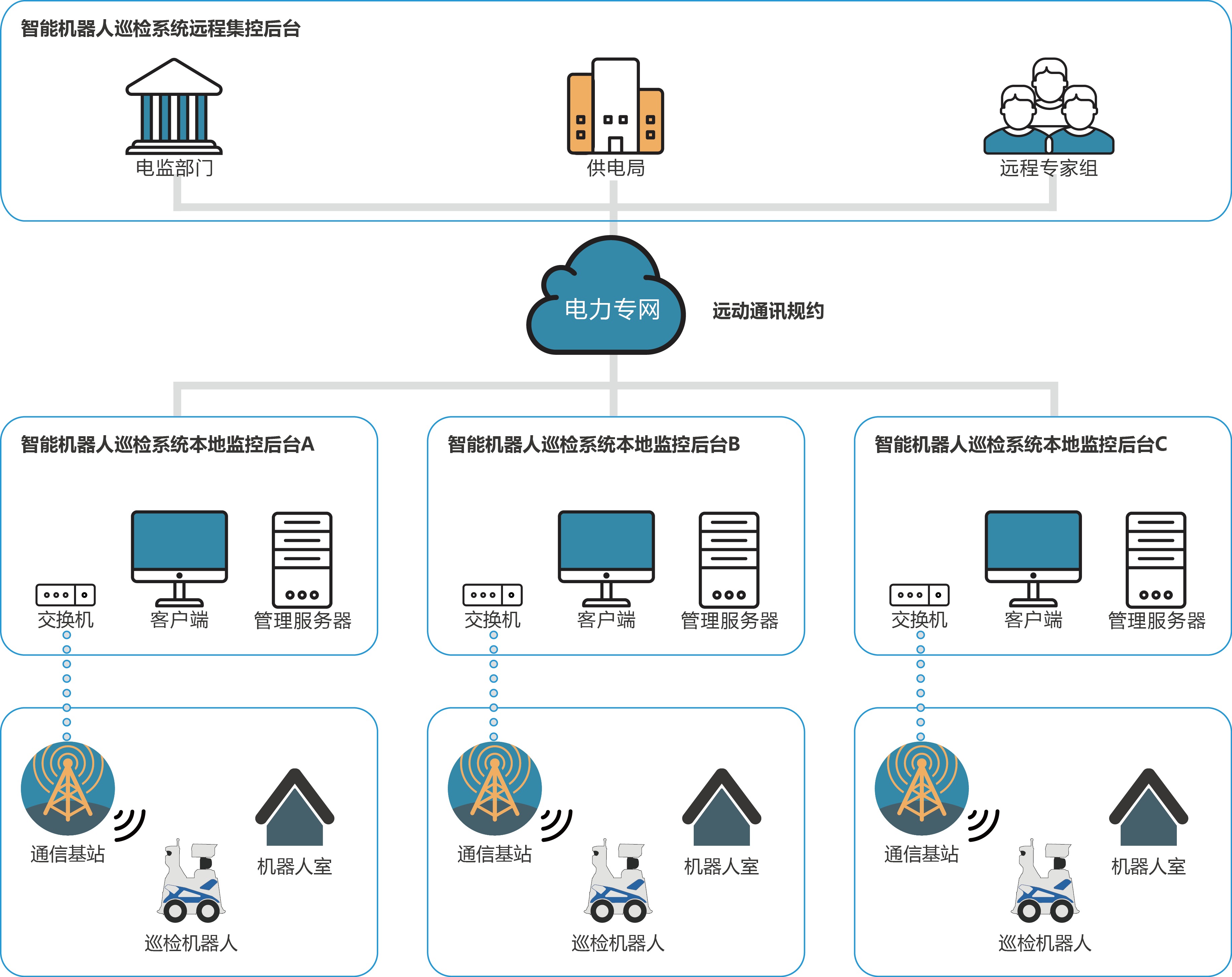 變電智能機(jī)器人巡檢系統(tǒng)由遠(yuǎn)程集控后臺(tái)、本地監(jiān)控后臺(tái)、通信系統(tǒng)、機(jī)器人室和變電站智能巡檢機(jī)器人五大部分組成:
