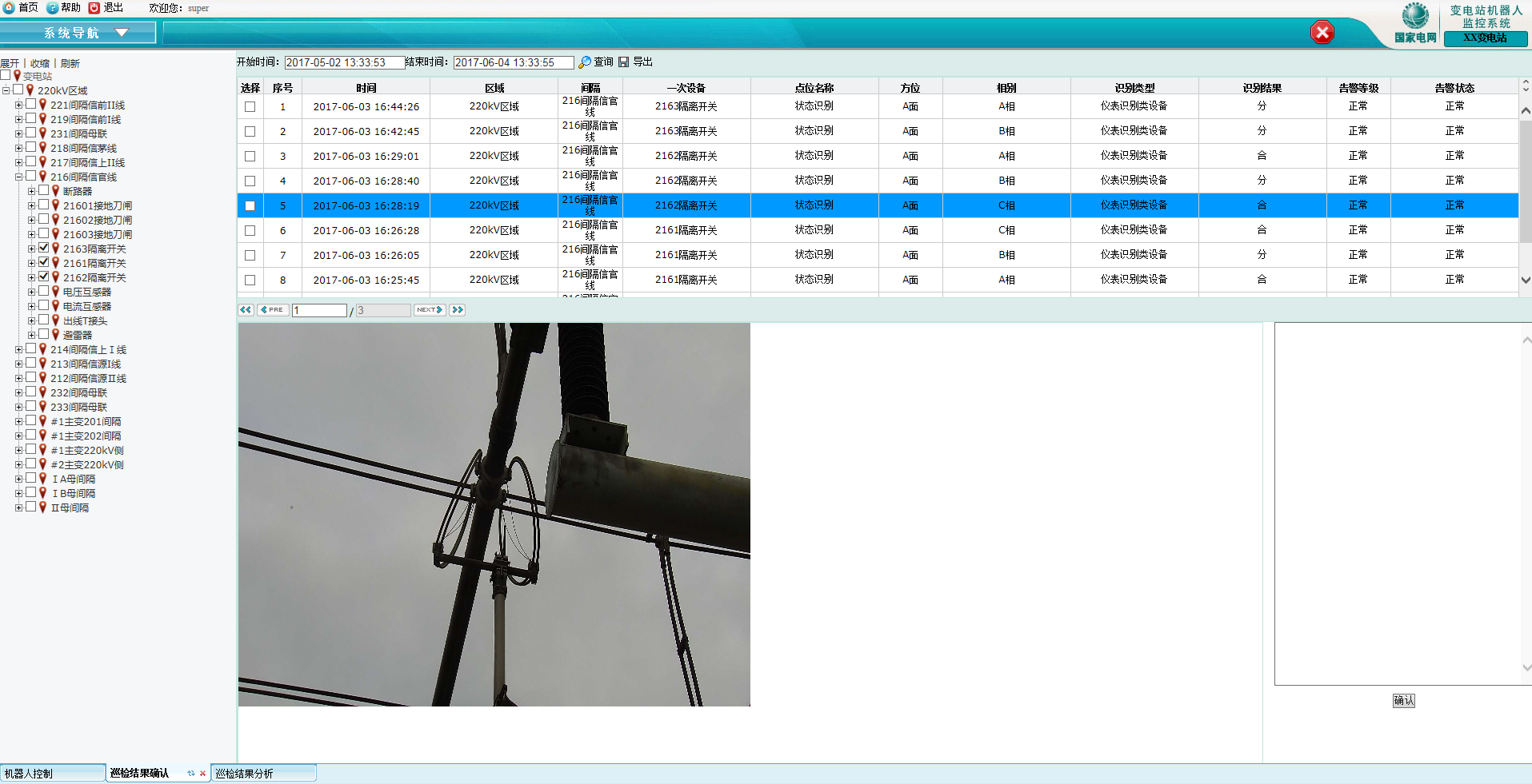 3)點擊『查詢』按鈕實現查詢將顯示所有的巡檢結果記錄,在下方頁面將顯示所有要搜索的巡檢信息(如巡檢時間、所在區域、間隔、一次設備、點位名稱、方位、相別、識別結果、告警等級、告警狀態);
