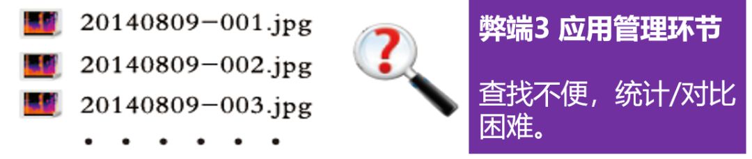 領導,您看這個缺陷,當時拍回來之后,班組長告訴我說,這個接頭是老缺陷,總是發熱,維修了好幾次,但還是熱,所以我決定去查一下過往的拍攝記錄,才發現,壓根沒法查。因為之前的熱像圖,沒怎么整理,就是直接打包一存,壓根不知道哪個圖片對應的是哪臺設備。其次,部分數據雖然有命名,但是查找起來也很麻煩,因為只能通過windows自帶的文件名搜索工具逐級查找,每個人的命名習慣不一樣,導致搜索起來也很麻煩,不能一次搞定。