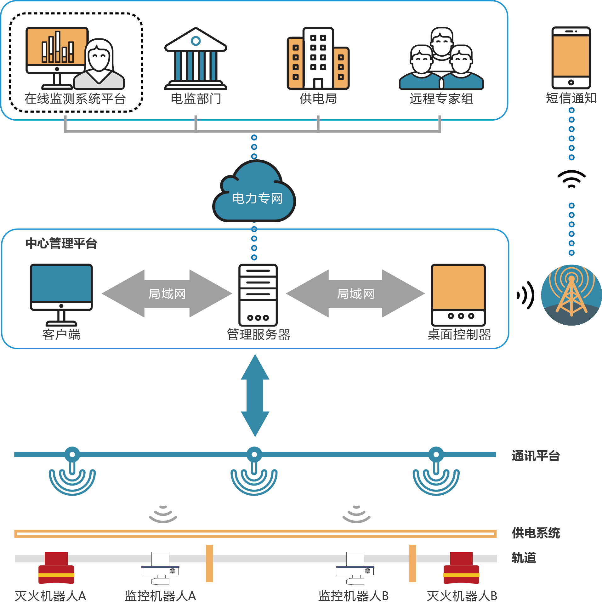 其中,隧道巡檢機(jī)器人采用軌道移動方式,搭載星光級高清攝像機(jī)及紅外熱成像儀,實(shí)現(xiàn)隧道實(shí)時監(jiān)控與紅外熱成像診斷;集成有害氣體、煙霧、光照度、溫濕度等傳感器以及定位裝置和語音對講系統(tǒng),使用戶實(shí)時掌控隧道環(huán)境信息,并通過監(jiān)控平臺實(shí)現(xiàn)對巡檢機(jī)器人的控制,數(shù)據(jù)接入、存儲、統(tǒng)計、GIS定位以及立體展示。同時,系統(tǒng)具備火災(zāi)報警聯(lián)動處置能力,滅火機(jī)器人可在巡檢機(jī)器人檢測到火情后第一時間到達(dá)事故段落、實(shí)施有效滅火處理措施。系統(tǒng)提供符合電力系統(tǒng)標(biāo)準(zhǔn)的IEC61850數(shù)據(jù)接口,方便接入電力大集控系統(tǒng)。