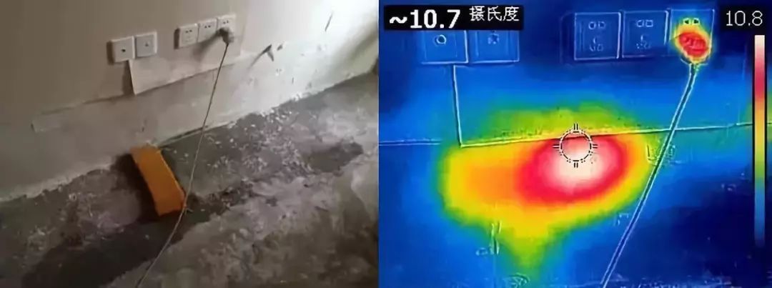 在現場可以看到漏水點在一個客臥內,墻上溫度很高(如上圖),而且就緊挨著衛生間的第三路。據此初步判斷,可能是衛生間墻內的第三路漏水導致客臥漏水。