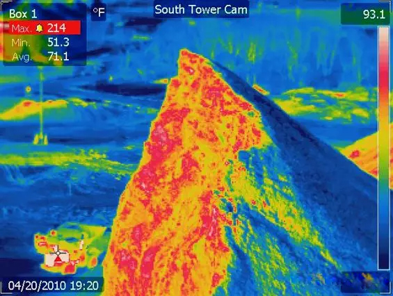 當煤發生自燃時,煤層表面的溫度升高,但肉眼并不能觀察到。紅外熱像儀采用640*480探測器,其像素是常規320*240熱像儀的4倍,距離是其2倍。所以,在探測煤層溫度時,可以在很遠的距離就可檢測到煤層表面的溫度,以圖像的形式呈現出來,在熱像儀顯示屏上可以清晰的看到高溫和低溫用不同的顏色標示,顯示的高溫區就是隱性火區,在發現后即可采取相應措施以防治煤層自燃。