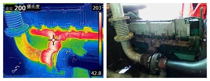 當然,它的用途遠遠不止這些,對于鉆井使用的12缸或16缸柴油機來說,用KT384紅外熱像儀來判斷各缸的工作狀況,以及排氣溫度狀況,就顯得非常方便了。對于并車使用的柴油機組,還可以清晰的反應出各機組的帶載情況。