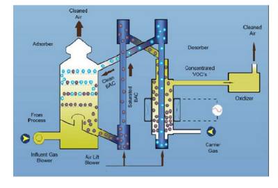 利用吸附劑(粒狀活性炭和活性炭纖維)的多孔結構,將廢氣中的VOC捕獲。將含VOC的有機廢氣通過活性炭床,其中的VOC被吸附劑吸附,廢氣得到凈化,而排入大氣。