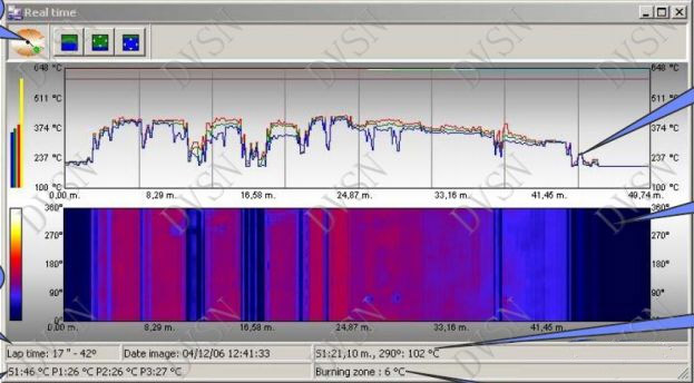 在實(shí)時(shí)畫面中查看爐窯各個(gè)區(qū)域最高溫度值、最低溫度值與平均溫度值,并能分析定位轉(zhuǎn)窯內(nèi)部結(jié)焦或耐火泥、耐火磚脫落位置與狀態(tài);